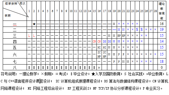 3.主要实践教学环节:国防教育、社会实践、程序设计课程设计、算法与数据结构课程设计、工程实训、计算机组成与系统结构课程设计、计算机网络课程设计、网络工程综合设计、网络协议编程课程设计、专业实习、毕业设计。