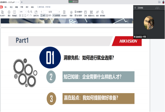 (通讯员:张颖旭、骆训凤)扬帆梦想,规划职场,共筑未来。为系统提升老员工职业生涯规划意识,引导新生做好校园生活安排,树立积极向上的价值观,为实现充分就业、高质量就业打好基础,伟德国际victor1946于2021年11月17日19:00,开展2021级新生线上职业规划教育,本次课程由海康威视公司何敏经理主讲,2021级全体同学参与此次活动。