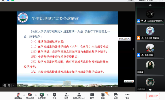 会议议程第二项,公司党委副书记颜学俊对公司及公司相关管理制度进行介绍,颜书记着重选取《伟德victor1946网站学籍管理》中部分内容做了详细解读。随后,颜书记又对员工来校途中及报到后在校期间的管理做出各项安全提示。会议议程第三项,公司2020级辅导员张颖旭针对员工返校前的准备工作及新生报到流程作出详细说明,并且对家长关心的宿舍问题,军训安排等做出详细解答。