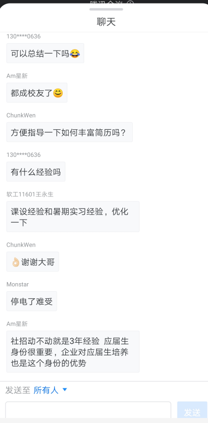 随后,王进宇、吴凡、王永生三名同学先后分享了自己的求职过程和在求职过程中总结的一些经验。王进宇同学目前已成功签约富士康下的鸿富锦精密工业(深圳)有限公司,他从如何写简历,如何投简历以及如何准备面试等三个方面进行了细致的讲解,最后着重强调了校招的重要性。吴凡同学已成功签约深圳市吉祥腾达科技有限公司,他主要从校园招聘求职的角度,围绕“如何搜集和筛选校园招聘信息”、“校园招聘的基本流程”、“签约的注意事项”等方面进行讲解。王永生同学成功签约北京华宇兴泰科技有限公司,他主要从我是谁,要给自己一个比较准确的定位;我从哪里来,对于想要就业的同学,多和学长学姐交流交流;我到哪里去,先选择一个自己喜欢的城市,再选择一个比较好的公司等方面进行相应的讲解。最后,颜书记对本次就业分享会进行总结,他希望2020届未找到工作的同学树立先就业、再择业的观念,更要充分利用自己应届毕业生的身份优势,提醒员工千万不要错过企业对2020届毕业生的校招,否则将会面临更大的就业压力。同时,他也希望2021届的准毕业生们早日做好求职准备,在明年毕业前都能找到相对满意的工作。