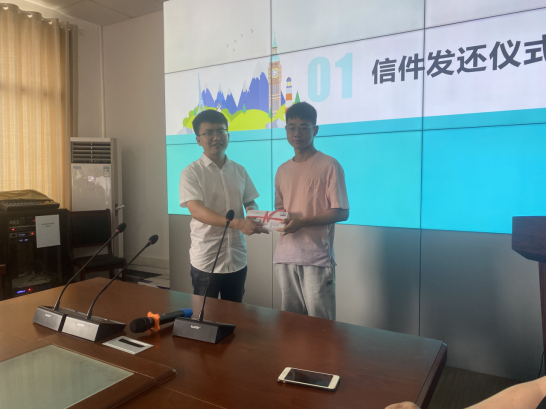 活动伊始,主持人介绍了本次活动的初衷。2019级原辅导员张颖旭老师以班级为单位逐一返还了2019级同学入学时写给自己的一封信。紧接着,2019级员工代表林沐雨、张君豪分别发言。两位同学与全场同学分享了两年前写给自己的书信,总结了大学两年的学习生活及成长,全场成员以热烈的掌声为之点赞。
