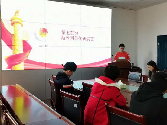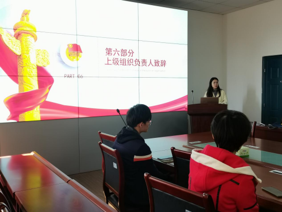 会议的最后,张茜老师作为上级团组织代表带来致辞。她首先对十四名新成员们表示祝贺和欢迎,并对他们做出了三点要求。一是希望他们能积极参与团委组织开展的活动,密切配合自己所在支部的工作开展;二是能牢记入团誓词,切实履行团员义务,努力成为一名优秀的共青团员。三是能全面发展,努力学习,在同学中起表率作用,尽心尽力为班级、为公司做出贡献,不断挑战自我,超越自我,争取早日成为一名光荣的共产党员。致辞结束后,会议在宏亮的团歌中圆满的落下帷幕。