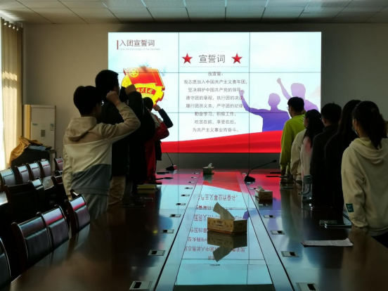 会议伊始,全体师生起立,共同奏唱国歌。紧接着,主持人何嘉仪宣读了2021年新发展团员名单,本次共有十四名同学光荣加入中国共青团。随后,老团员代表许雨青同学为新入团的成员们颁发团员证。在主持人的带领下,十四名新成员在鲜艳的团旗下庄严宣誓,铿锵有力的宣誓声在教室中回荡。他们将握拳的右手举起过肩,声音洪亮,深情而庄重。