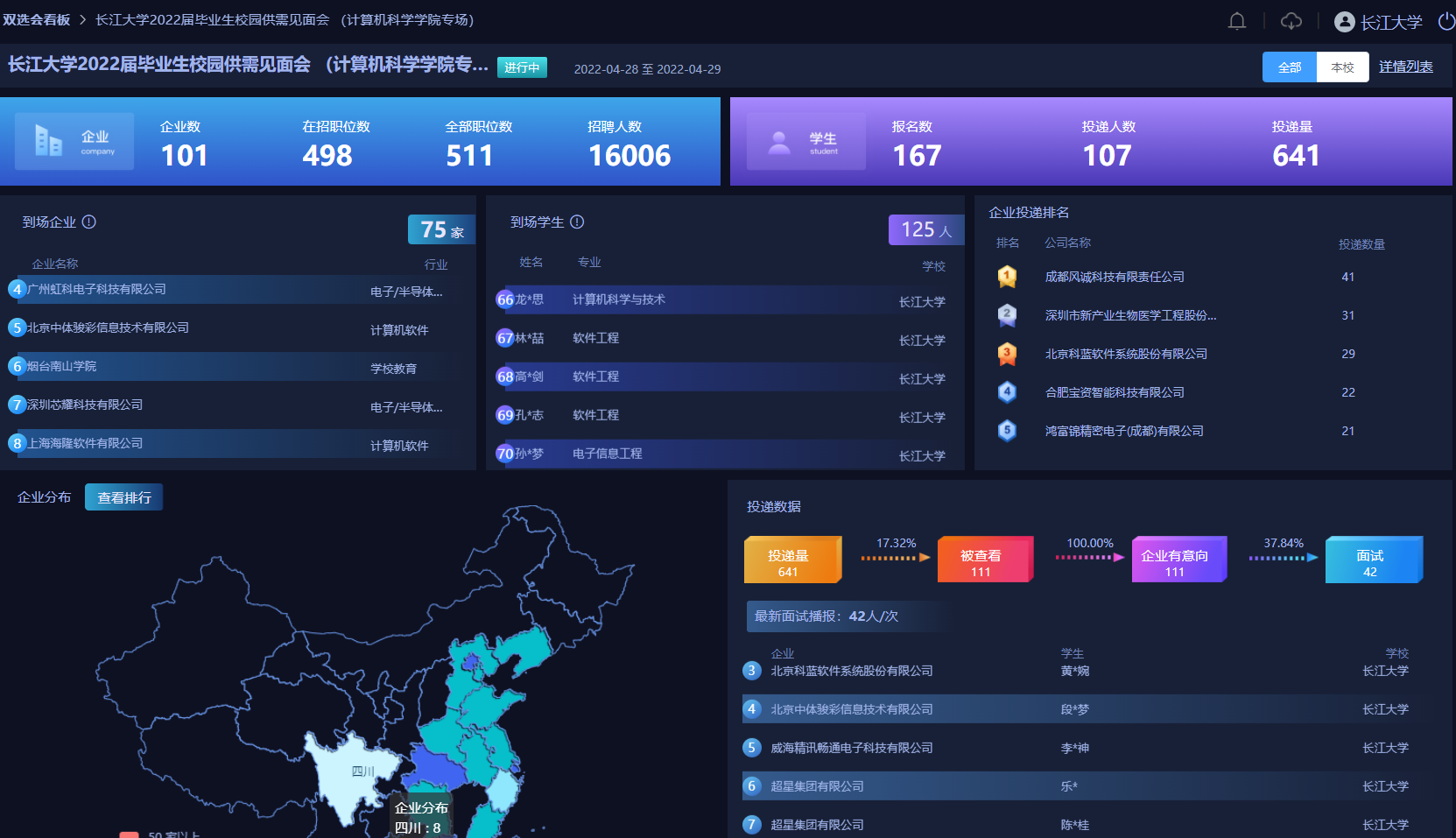 线上双选会邀请校企合作及员工企业101家,提供岗位数498个,招聘计划人数16006人。员工报名数167人,简历投递人数107人,投递量641,被查看111份,企业意向111份,被查看意向率达100%,面试人数42人,面试率37.84%,本次线上双选会企业数和员工参加人数多、成效显著。
