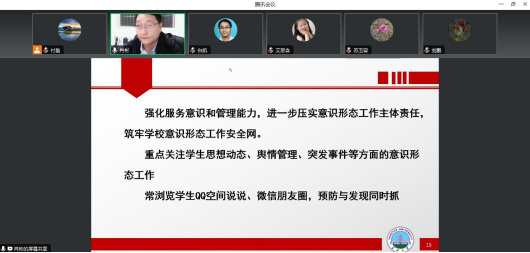 本次工作会议肖彬副书记主要从“日常管理及安全稳定、心理健康教育工作、就业工作、学业情况、意识形态工作”等五个方面对班主任老师提出了工作要求,通过结合公司员工工作的特点和具体事例,为公司员工定制了一套全面的关心方案和安全防护措施。