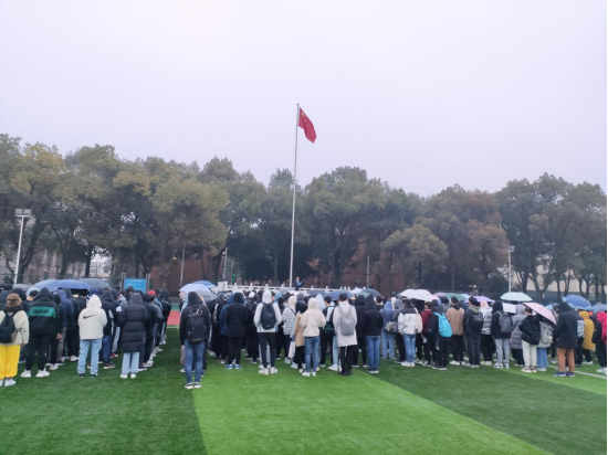 本次升旗仪式共分为升国旗、员工代表发言、教师代表发言三个环节。仪式第一项,升国旗奏国歌。当一切准备就绪后全场肃静,蒙蒙细雨中,国旗护卫队队员们迈着矫健的步伐护送鲜艳的五星红旗缓缓走来。当雄伟庄严的国歌奏响,五星红旗冉冉升起,迎风飘扬,全体师生心潮澎湃唱响国歌,向国旗行注目礼。