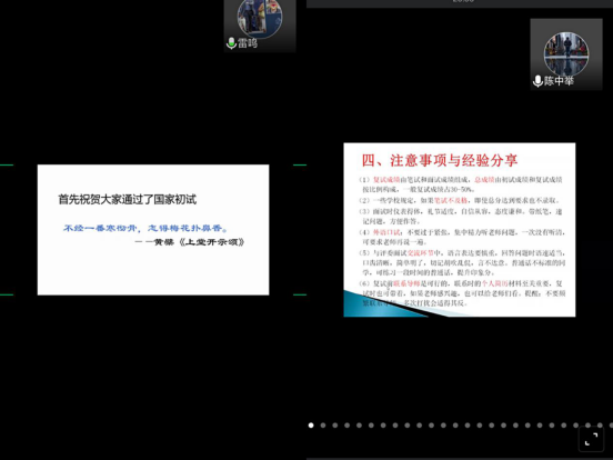 首先,雷鸣老师给大家分享复试经验。雷老师用“知己知彼,百战不殆”这句名言概括了复试流程。“知己”也就是自己做好充分准备,充分了解自己的强项和不足,学会推销自己;“知彼”则是摸清复试情况,心中有数才不慌。随后,陈中举老师给大家提醒了复试应注意的三大环节:笔试、面试和体检。陈老师着重强调了复试的一个小技巧——提前准备好一份简历,具体包括大学期间的自身项目经历、课程设计、自编程序、证书、获奖情况等等,这能够给复试评委留下很好的第一印象。王同喜老师则从充满信心、充分准备、注意事项和常见提问四个方面为同学们解读了考研复试。信心比黄金都重要,但信心不等于盲目自信,信心源于充分的准备。初试是高分,有起步优势,但不可懈怠;初试压校线,有翻盘可能,能后来居上。并且,王老师列举了几个经典的面试题给大家传授回答技巧。接着,白凯老师给同学们讲解了考研调剂事项。如果员工初试成绩与理想院校有差距,要立刻准备调剂,有研要读。一是积极打听自身排名,以免耽误调剂最佳时机;二是广泛撒网,多找机会,多收集调剂信息;三是主动出击,电话联系招办老师;四是多项选择,时刻保持联系。白老师也寄语大家,研究生不是终点,未来还有很长的路要走。