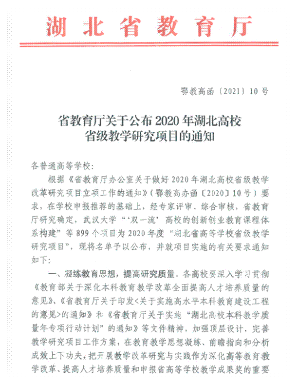 近日,湖北省教育厅印发了《省教育厅关于公布2020年湖北高校省级教学研究项目的通知》(鄂教高函[2021]10号),伟德国际victor1946共获3项,获批立项数创下近10年来一次性立项数新高。