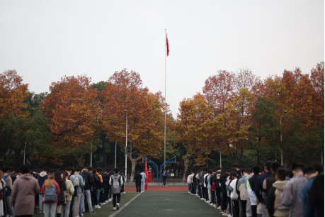 升旗仪式第一项:升国旗,奏唱国歌,全体师生行注目礼。伴随着秋风,国旗护卫队迈着铿锵的步伐来到了国旗台下,全场一片肃静。庄严的国歌响起,鲜艳的五星红旗徐徐展开,冉冉升起。在场的师生纷纷仰起头,满怀崇敬之情向国旗行注目礼,表达对祖国的崇高敬意。