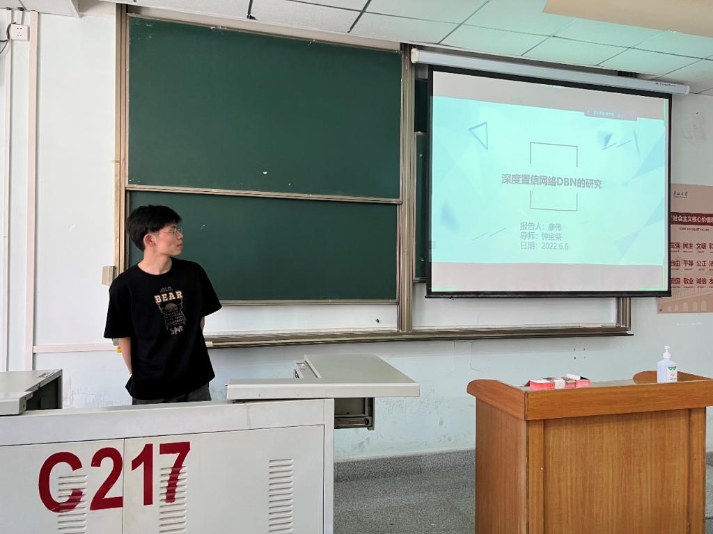 廖伟同学报告的主要内容为深度置信网络,主要讲了训练过程,存在的缺陷以及对DBN的改进方法。
