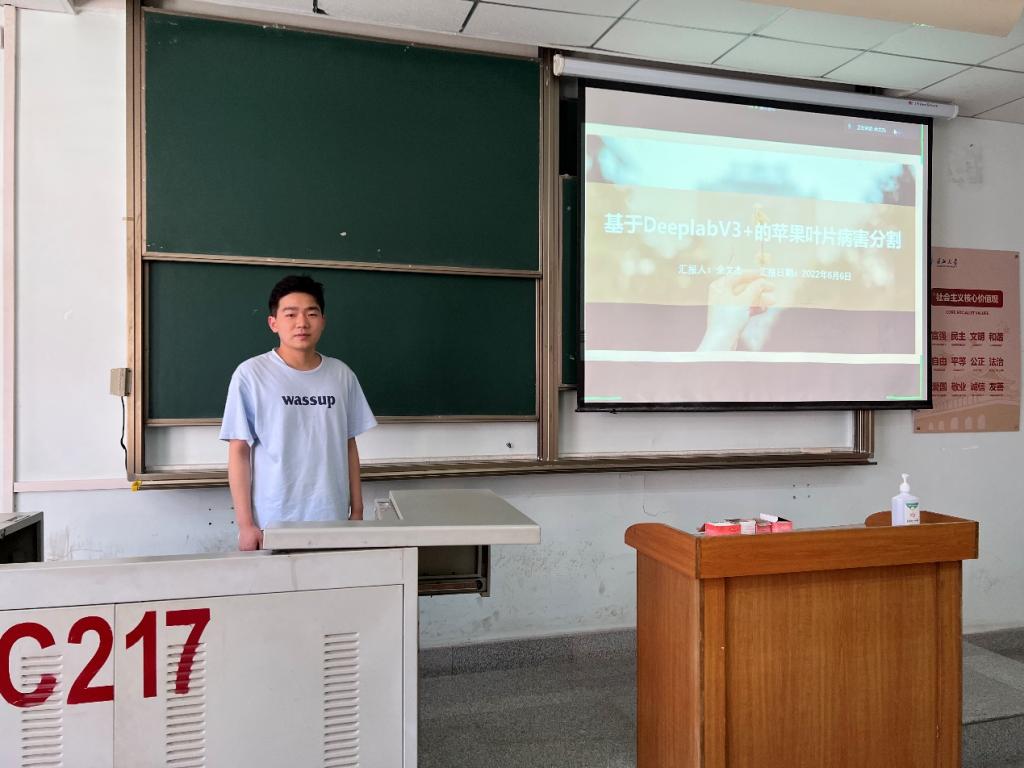 余文杰同学报告的主要内容介绍了MobileNetV2分类网络和DeeplabV3+分割网络的原理,展示了自己实现的基于DeeplabV3+网络的苹果叶片病害分割模型,实现对苹果叶片病害快速、准确的分割。