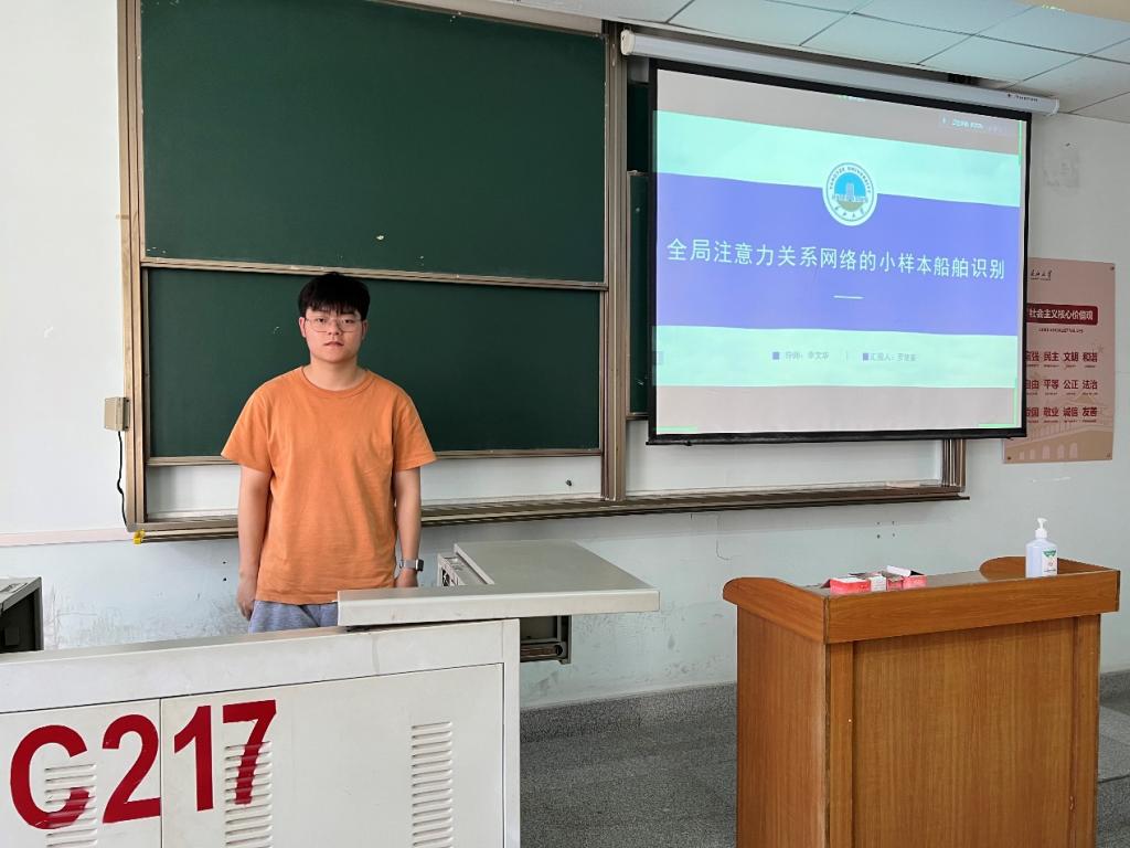 罗楚豪同学报告的主要内容为基于全局注意力关系网络的小样本船舶识别,给关系网络加入注意力机制,用以解决样本数量不均匀导致的过拟合,提高船舶识别率。