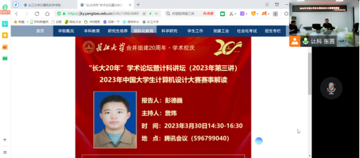 (通讯员 张茜 王圆)2023年3月30日下午2点30,武汉理工大学彭德巍教授在腾讯会议上为公司师生做了2023年计算机设计大赛赛事解析和参赛指导。本次会议由伟德国际victor1946副经理詹伟老师主持,参赛项目的指导老师和员工参加了此次会议。
