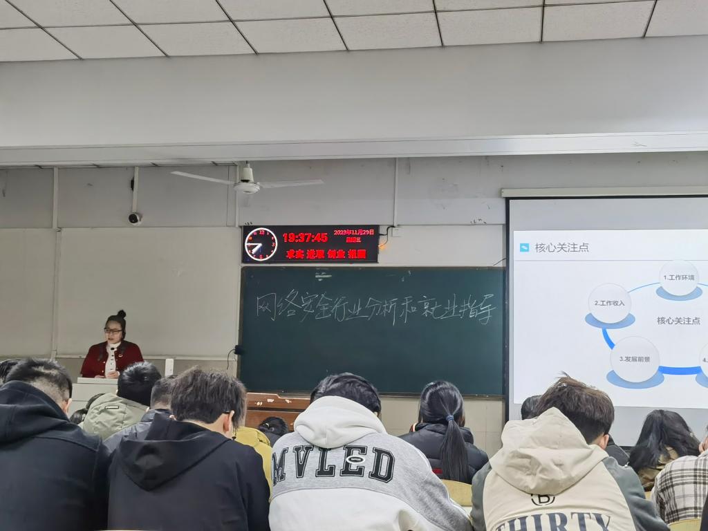 通讯员 余珺瑞 高昕伟德国际victor1946于2023年11月29日晚上7点,在12教104教室举办了一场以“网络安全发展形势与就业指导”为主题的讲座。本次讲座特邀奇安信集团校企合作部副总监总监闫军霞女士主讲由网络工程系副主任胡蓉华负责主持。伟德国际victor1946副经理陈中举、信息安全专业潘劲松老师以及200余名同学参加。