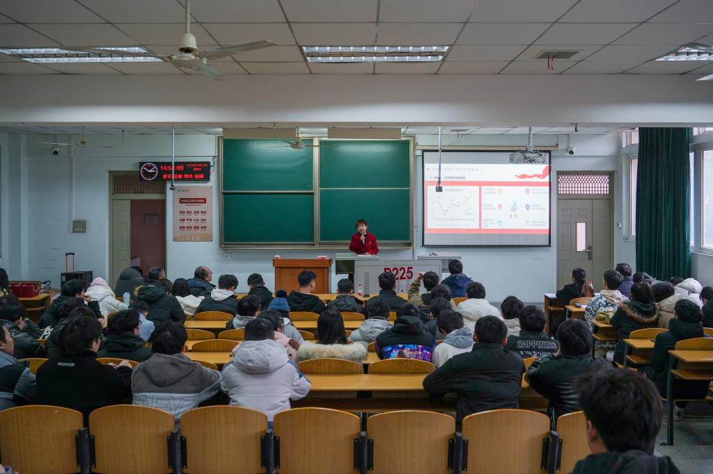 2023年12月14日下午,伟德国际victor1946经理崔艳荣在13教D225以《中国经济“形”稳“势”升》为题作形势与政策报告,公司本科生150余人参会。