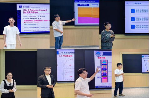 接下来,由七位优秀的研究生作为主讲人,就自己研究领域与研究成果依次进行了学术汇报。谢军同学以《基于超分辨率的消化道息肉检测算法》为主题,引入超分辨率技术,将医学影像重建,提高了对细微病变的检测能力。尹星宇同学以《神机妙测——智慧港口船舶载重监测系统》为主题,提出一种安全高效公平的船舶载重测量系统,实现了对船舶装载情况的精准监测和数据分析。聂淑晴同学以《锂离子电池锡基负极材料异质结构制备及性能研究》为主题,提出一种新的负极材料,并阐述了其性能优化方法。吉仁静同学以《基于干水制备固液复合吸附剂及其CO2吸附性能研究》为主题,阐述了通过干水技术制备的固液复合吸附剂的优异性能。张政同学以《基于木质素水凝胶多途径处理印染废水》为主题,向我们分享了一种催化剂改进方案,在污水处理领域具有重要意义。张一铎同学以《金属封隔器密封结构设计及密封性能研究》为主题,详细讲解了一种适用于高温高压金属封隔器密封结构的超弹性金属材料β-NiTi合金。肖阳同学以《分层采油泵中迷宫密封漏失问题分析》为主题,对分采泵间隙流场构建模型并进行仿真实验,深入探讨了迷宫密封漏失的机理和影响因素。