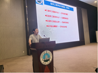 随后,王同喜老师围绕软件工程是什么?学什么?怎么学?毕业去哪里?四个问题,从宏观层面为同学们详细解读软件工程专业的定位、知识体系与学习要点、学习方法和职业规划,仿佛为同学们绘制了一幅清晰的专业地图。向华老师则化身“竞赛引路人”,详细介绍各类计算机与软件竞赛的情况,包括ACM、蓝桥杯等知名赛事,并简单介绍了参加这些竞赛的可操作路径,鼓励同学们在竞赛的舞台上磨砺专业能力。李梦霞老师从学风建设出发,语重心长地阐述学习习惯与方法的重要性,激励同学们以踏实的态度钻研专业技能。陈应霞老师提出软件工程专业育人宗旨:“以员工发展为中心,以提高培养质量为导向,以培养优秀人才为目标“。另外,陈应霞老师还详细介绍了本科导师制,要求还没有选定导师的同学尽快选好导师,确保每位同学都能得到帮扶和指导。