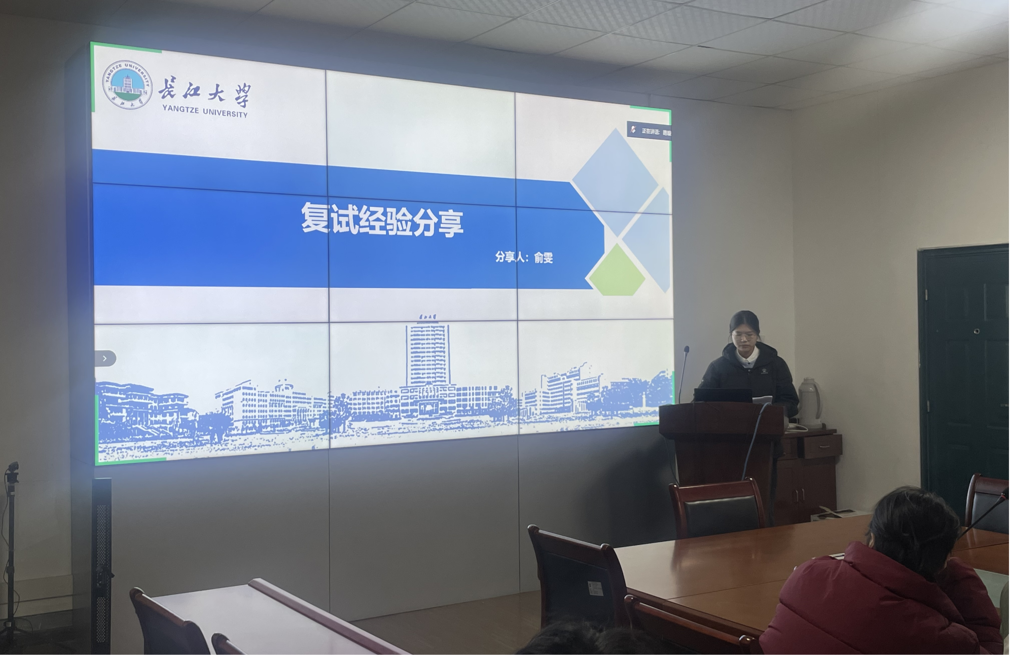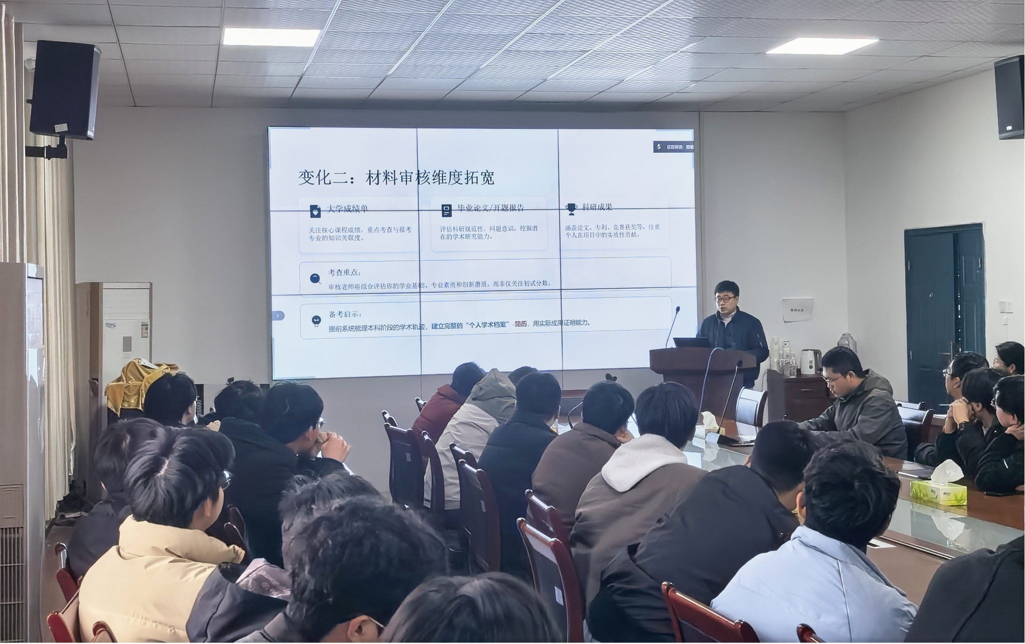 在经验分享环节,已成功升学的俞雯、魏槟炀两位同学,以亲身经历为大家“传经送宝”。他们从备考规划、心态调整、导师联系等方面分享了实用心得,内容真切详实,现场反响热烈。
