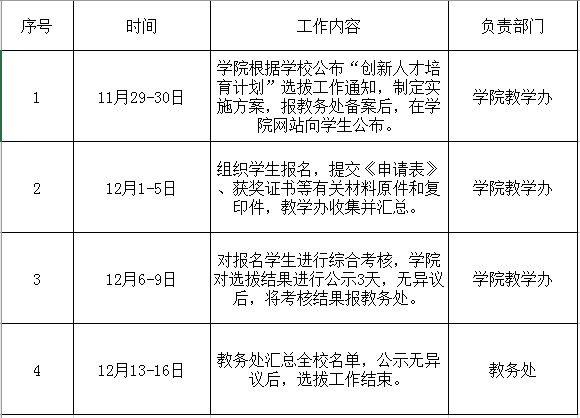 (四)教务处将通过复审的员工名单报公司“创新人才培育计划”工作领导小组审定,并将结果进行公示,如无异议,则确定其为“创新人才培育计划”入选员工。