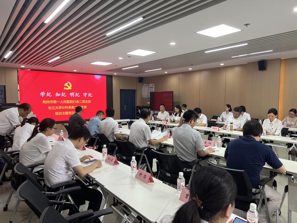 为深化党纪学习教育成果,进一步发挥党建政治引领作用,7月3日下午,由荆州市第一人民医公司党委书记李茂坤同志带领院行政二党支部全体党员与伟德国际victor1946计科系教工党支部在文科大楼1008会议室联合开展了“学研互促,打造产教融合高素质党员队伍”主题党日活动。伟德victor1946网站党委常委、副书记、副董事长杜国锋,计算机科学公司党委书记郑健同志参加主题党日活动。