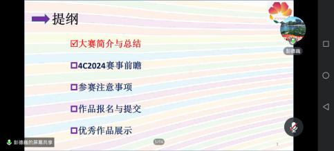 彭德巍,中国老员工计算机设计大赛中南地区赛组委会执行委员,现任武汉理工大学计算机与人工智能公司副教授湖北省人工智能学会理事,主要从事人工智能、移动计算等领域的研究与教学工作。长期担任各类科竞赛评审专家,具有丰富的大赛指导经验本次讲座,彭教授主要从大赛简介与总结、4C2024赛事前瞻、参赛注意事项、作品报名与提交、优秀作品展示等五个方面进行了详细讲解。在4C2024赛事前瞻上,彭教授着重强调,今年赛事与往年相比有改动,有些赛道的类别进行了优化。同时,在参赛注意事项上,彭教授从报名比赛的资料填写、参赛过程的素材准备到现场答辩形式,从校赛到省赛再到国赛,事无巨细的给同学们进行了详细的讲解。在会议尾声,彭教授展示出往届许多优秀作品供员工们参考。在最后的答疑环节,针对同学们提出的各项疑问,彭教授也一一做了详细讲解。